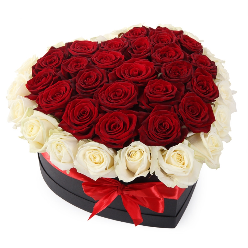 25 красных роз, 20 белых роз, коробка в виде сердца, атласная лента.