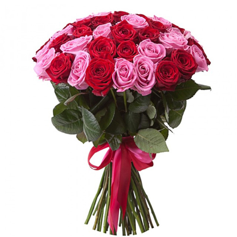 Букет состоит из 51 розовая и красная роза, прозрачная упаковка, атласная лента.